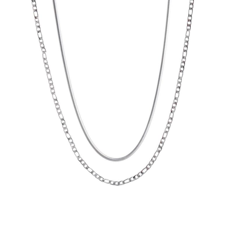 Ge din stil en lyxig känsla med detta 2-radiga halsband i stål. Halsbandet är 80/90 cm långt och består av två kedjor i olika utföranden – en slät snakekedja och en klassisk länk. Kombinationen skapar en stilfull kontrast som gör smycket lätt att bära både till vardag och fest. Ett smycke som ger en markerad look utan att kännas överarbetad.