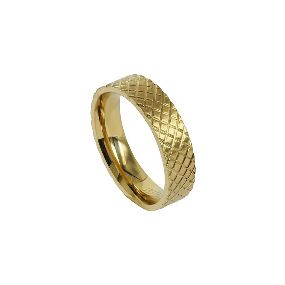 Ring tillverkad av stål och kan utan problem bäras dagligen, utan oro för slitage eller missfärgning. Ringen har en matt finish och texturerade detaljer.