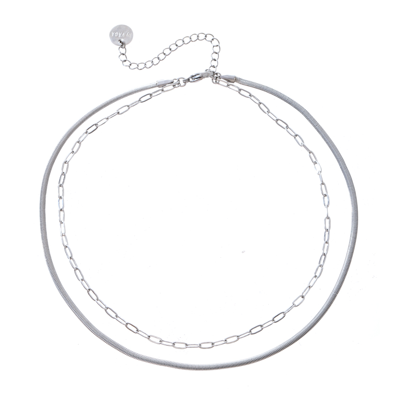 Ett 2-radigt halsband i stål. Kedjorna är 39 och 44 cm långa med en 8 cm förlängning för justerbar passform.