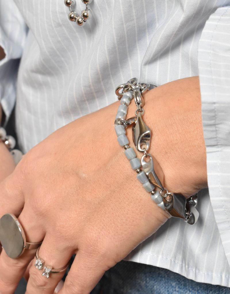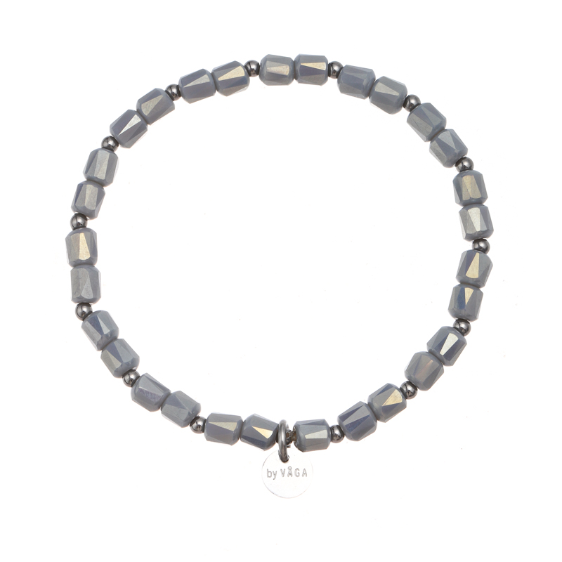Detta elastiska armband kombinerar slipade glaskristaller med små stålkulor för en subtil kontrast. Kristallerna är 5 mm breda och ger en lätt skimrande effekt som fångar ljuset. Ett smycke som fungerar lika bra ensamt som i kombination med andra armband för en personlig stil.