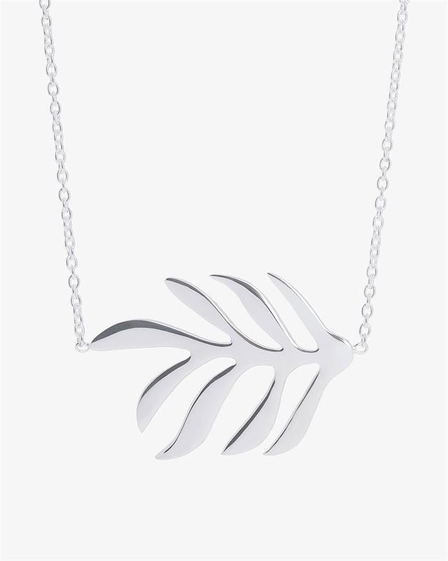 Ett silverhalsband med ett stort hänge framtill. Halsbandet har en design av ett höstlöv, en organisk form inspirerad av den nordiska naturens tidlösa elegans. Löven ger oss de första tecknen på att årstiderna skiftar. De ändrar färg och form överlämnar sig till nuets skönhet.