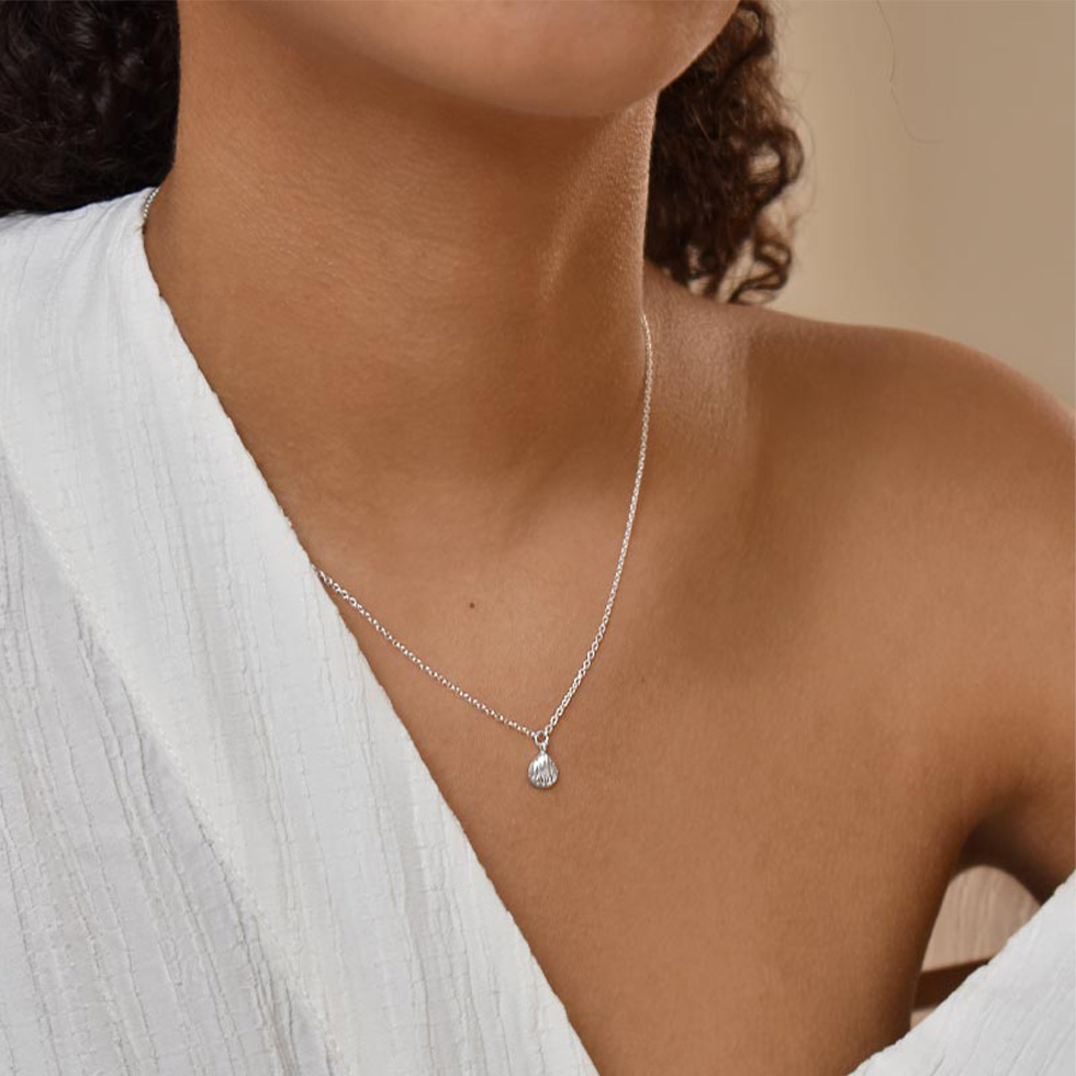 Ett silverhalsband i form av en kvist framtill i återvunnet silver. På den ändlösa stranden ligger snäckskal utspridda och omfamnade av sanden. Vi strosar barfota, känner sanden mellan tårna och är tacksamma över naturens skönhet.