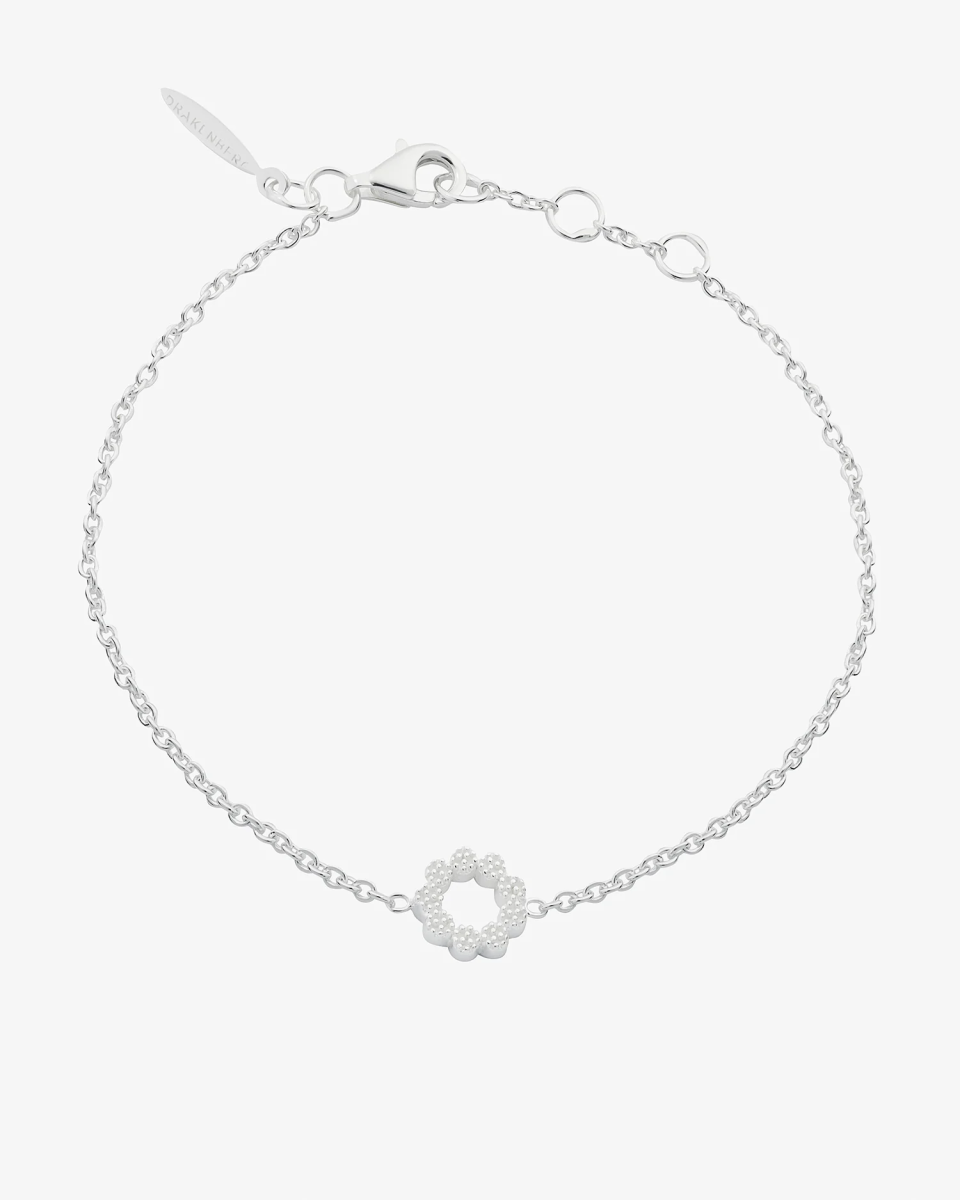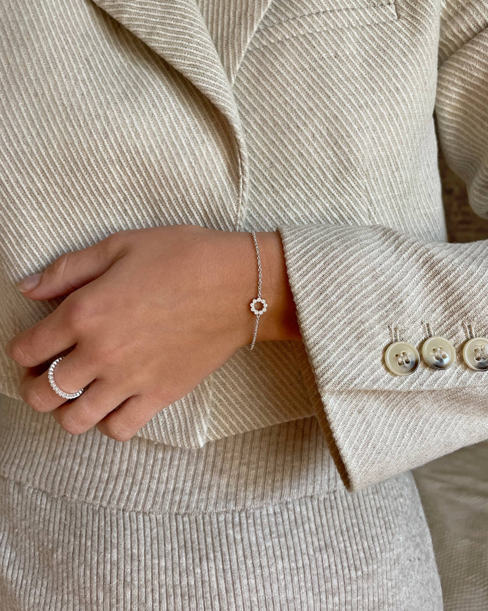 Ett minimalistiskt silverarmband på en tunn kedja med en rund öppen cirkelform. Cirkeln har en prickig strukturerad yta som ger en vacker skimrande effekt.