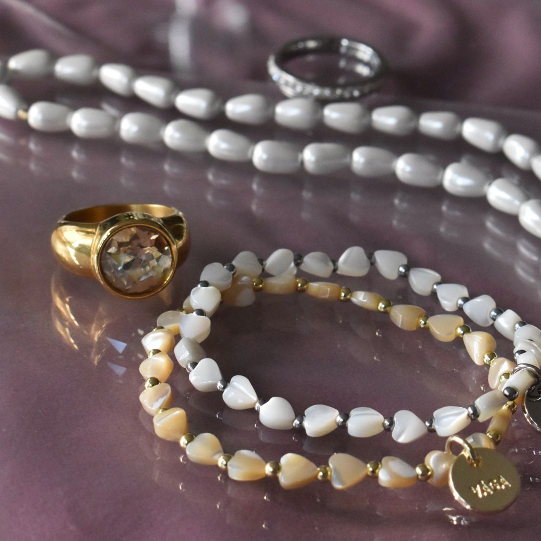 Garbo är ett nätt armband med små, knappt synliga hjärtan i hög kvalitet av snäckskal med en fantastisk lyster. Testa detta armband tillsammans med en kedja. Armbandet är annars väldigt smakfullt i sin enkelhet. Eller som present till någon du tycker om. Armbandet är i resår så det passar de flesta.
