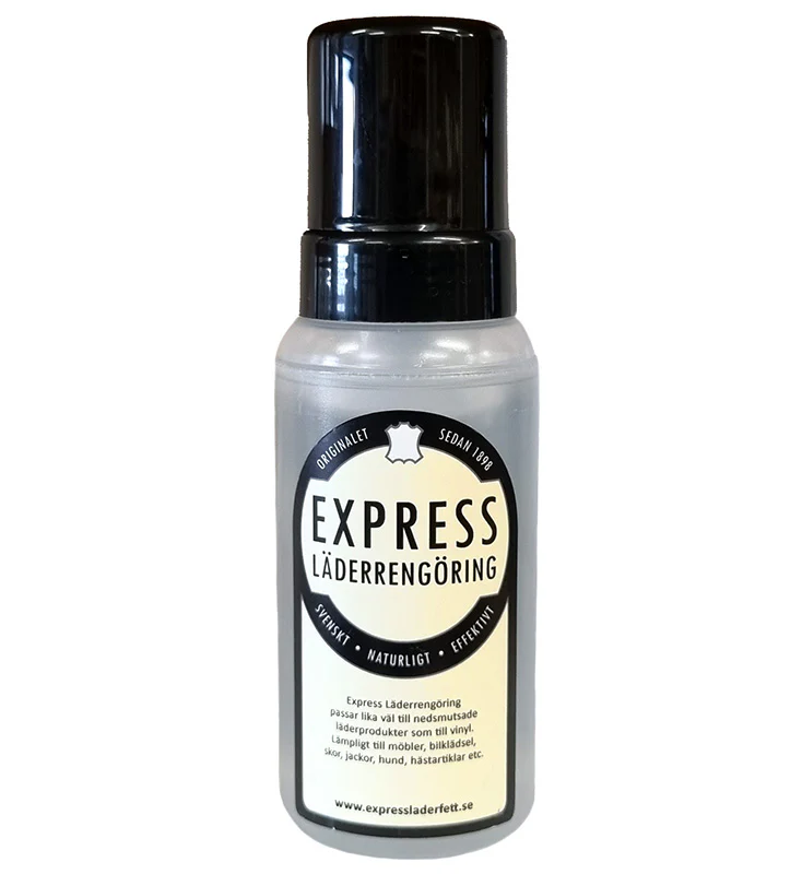 Express Läderrengöring i skumform passar till att rengöra läder på väl nedsmutsade ytor på alla typer av läderprodukter, utom mocka och nubuck. Läderrengöringsmedlet är lämpligt till skinnmöbler, bilklädslar, skinnjackor, väskor, skor, hästartiklar, mm.
