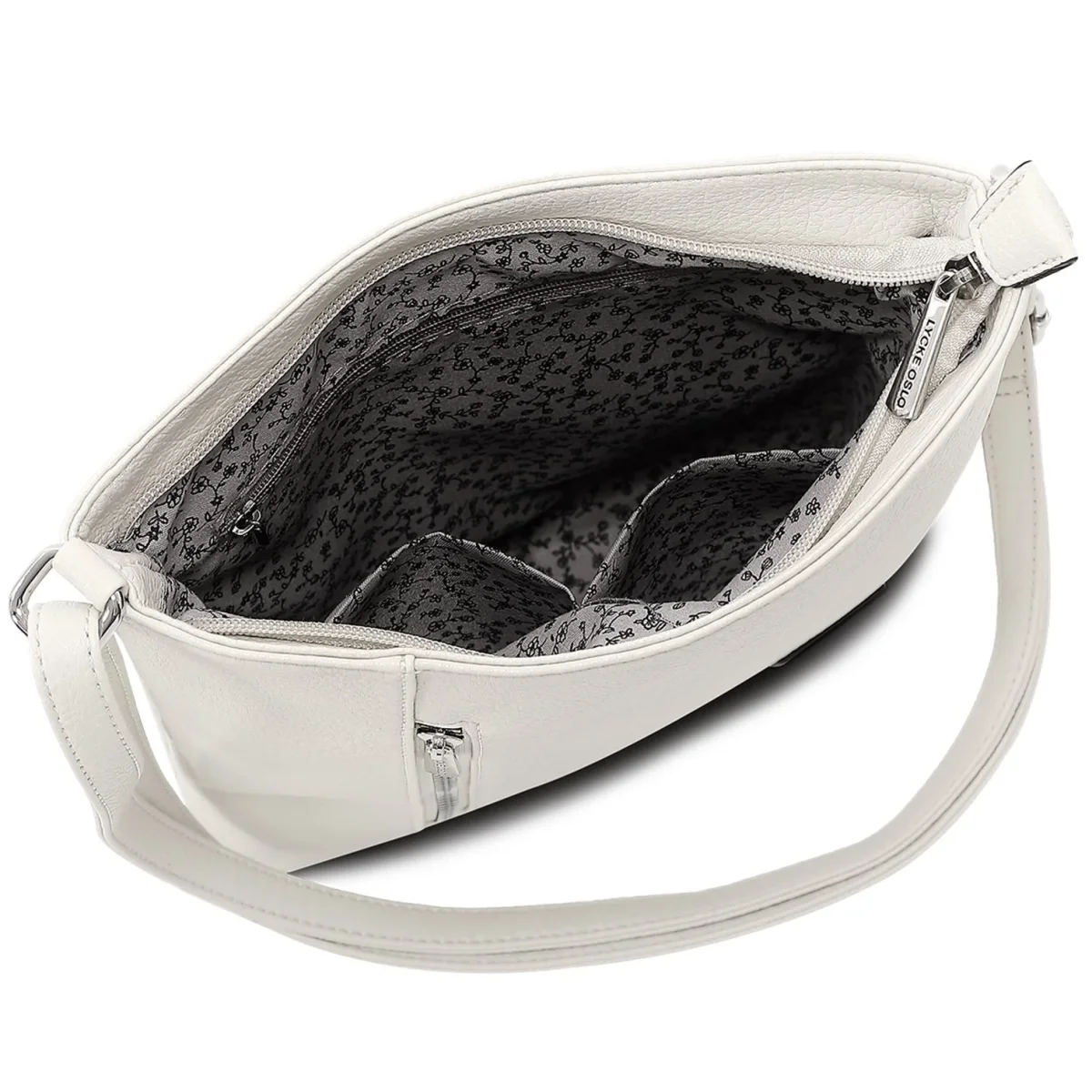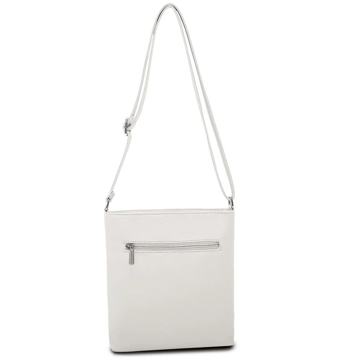 Medium storlek, som gör att du får med det mesta, trots sin slimmade design. Huvudfacket stängs med blixtlås och fronten pryds av ett långt fack med dragkedja och även på baksidan, dekorativt metallblixtlåsförsett fack. Axelremmen är steglöst justerbar så du kan bära väskan över kroppen.